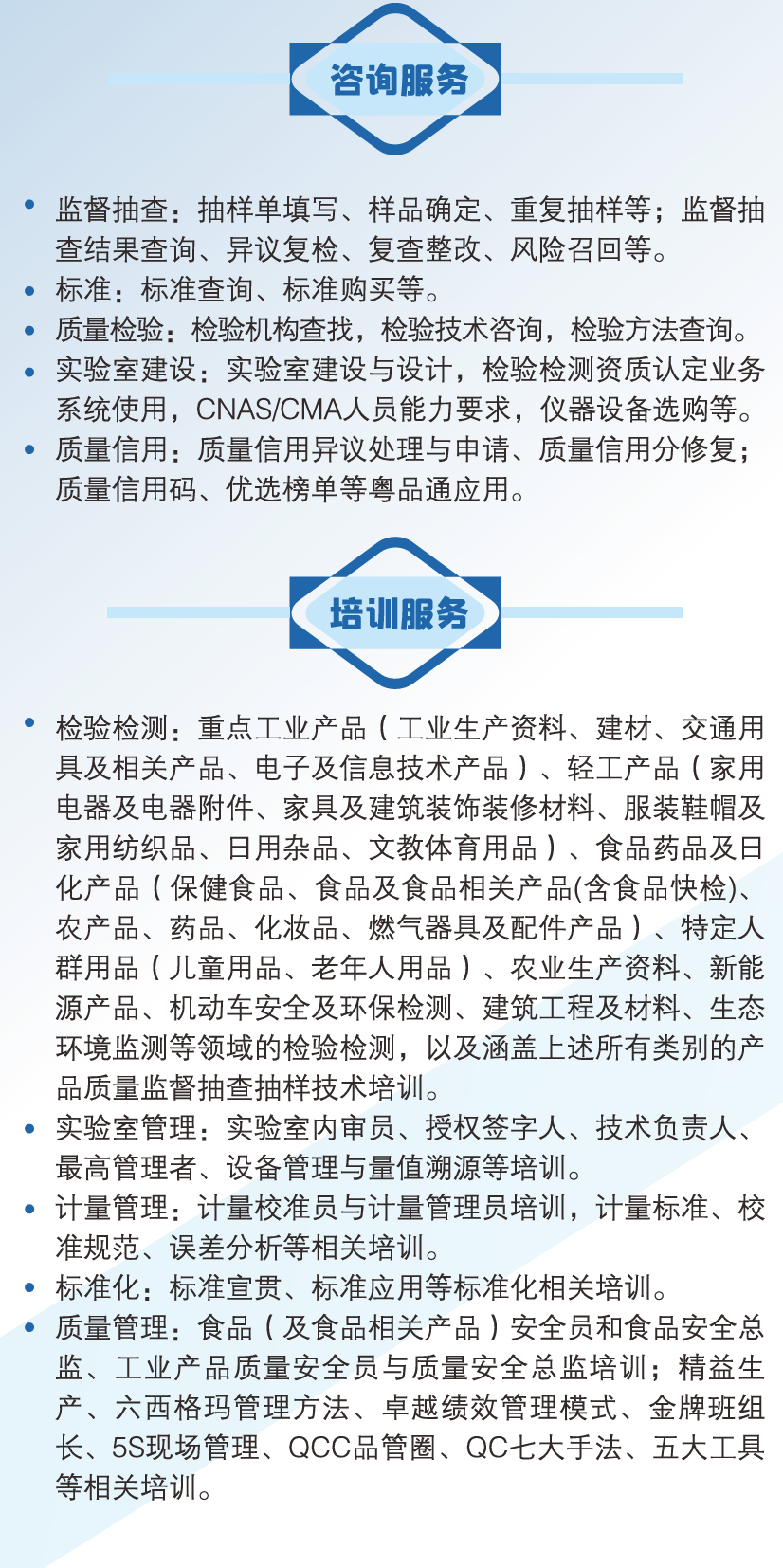 检验检测:重点工业产品(工业生产资料、建材、交通用具及相关产品、电子及信息技术产品)、轻工产品(家用电器及电滿輓器附件、家具及建筑装饰装修材料、服装鞋帽及家用纺织品、日用杂品、文教体育用品)、食品药品及日化产品(保健食品、食品及食品相关产品(含食品快检)、农产品、药品、化妆品、燃气器具及配件产品)、特定人群用品(儿童用品、老年人用品)、农业生产资料、新能源产品、机动车安全及环保检测、建筑工程及材料、生态环境监测等领域的检验检测,以及涵盖上述所有类别的产品质量监督抽查抽样技术培训。