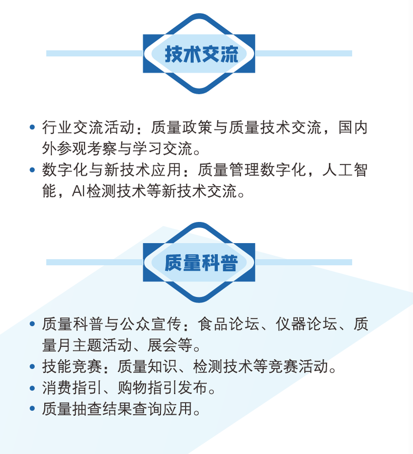 质量科普与公众宣传:食品论坛、仪器论坛、质量月主题活动、展会等。